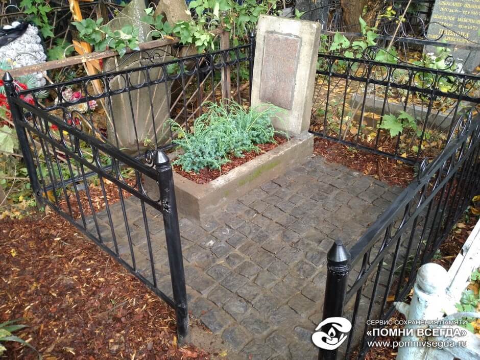Итог такой. Памятник очистили и поправили. Ограду покрасили. Пол уложили. Цветник засажен вечнозелёными. Надпись обновили. Могила восстановлена.