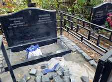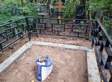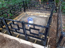 Первым делом мы демонтировали с территории участка кресты и ограждение, параллельно готовя землю к брусчатке. Когда подготовительные работы были завершены мы установили оградке, по низу которой сделали периметр из опалубки для последующей заливки бетоном.