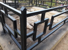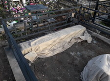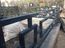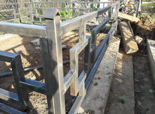 Возвращаемся на могилу. Подготавливаем оградку к покраске, зачищая её от старого покрытия. Параллельно устанавливаем подставку для памятника.