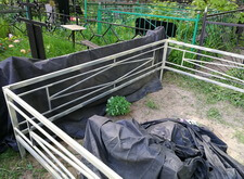 На фотографиях видно, как мы готовим оградку к покраске. Перед началом проведения работ мы обязательно укрываем плотной тканью как участок клиента, так и окружающие его места захоронения, чтобы случайно попавшая на памятники краска не создавала лишних проблем.