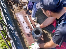 Далее приступаем к установке подставки памятника. После того, как она была возвращена на своё место, размечаем цветник. Параллельно работаем с периметром могилы: по краю пускаем металлическую планку, которая послужит границей брусчатки.