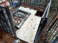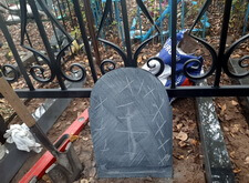 Для начала мы взялись за измерения памятника: нам предстояло изготовить табличку на лицевую сторону надгробья, а верх вновь украсить православным крестом.